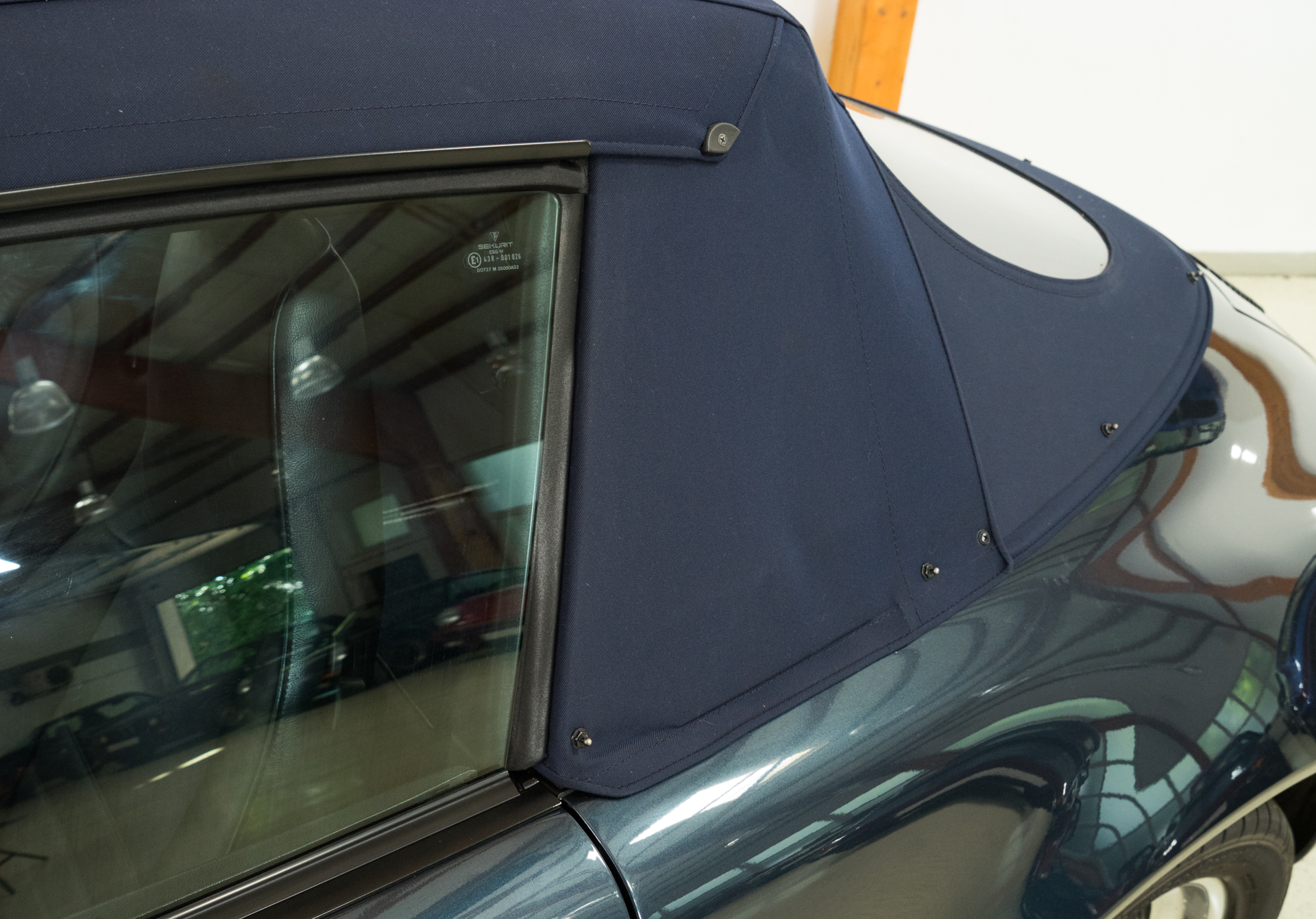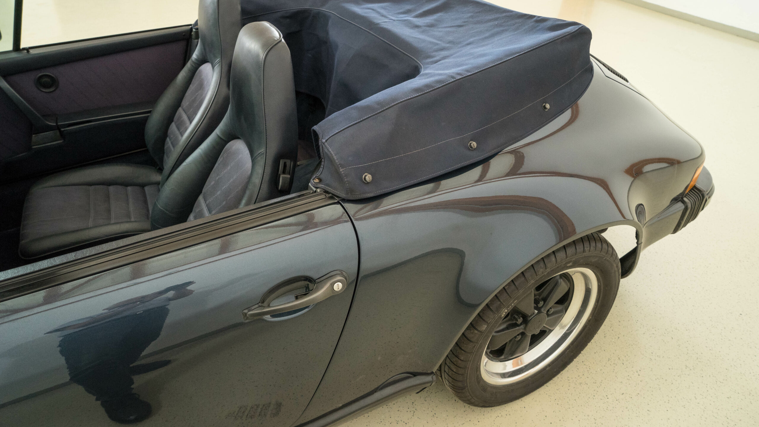 Das gepflegte Fahrzeug hat ein sehr gut erhaltenes elektrisches, dunkelblaues Verdeck und eine dunkelblaue Inneneinrichtung. Sitze und Türverkleidungen sind in Leder / Stoffkombination ausgeführt. Der Stoff, gewoben mit Porscheschriftzug, ist nicht ausgeblichen und zeigt auch keine Abriebsstellen.