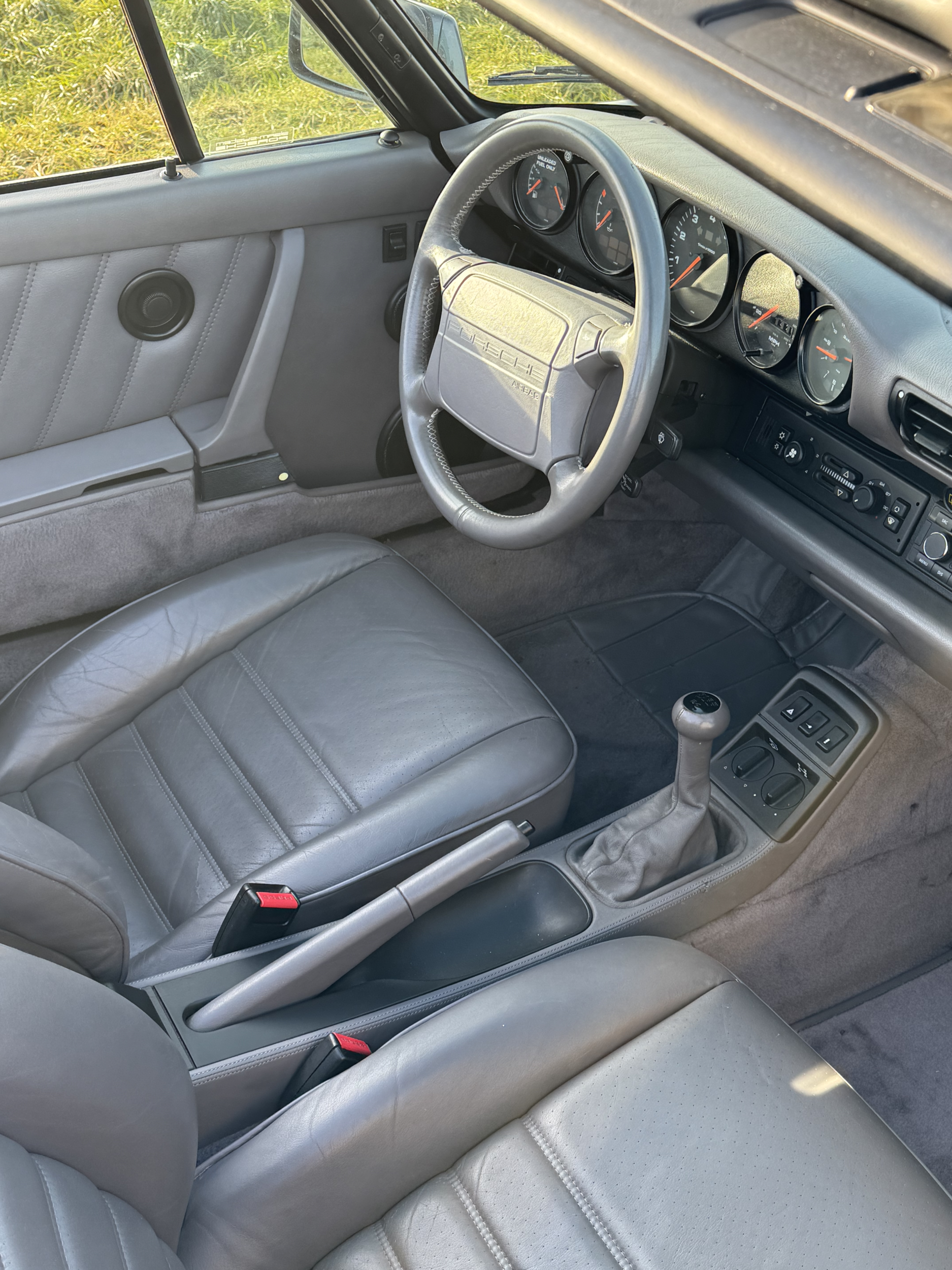 In der Farbe Schiefergrau Metallic macht insbesondere ein 964 Cabriolet eine gute Figur. Das schwarze Verdeck und die graue Innenausstattung unterstreichen das elegante Farbbild perfekt. Der Porsche überzeugt sowohl für seine Zeit in den USA bis 2022 als auch für die Zeit in Deutschland mit einer detaillierten Historie. Der Kilometerstand und auch die regelmäßige Wartung in Porschezentren wird durch ein Carfax, Scheckhefteinträge und Rechnungen nachgewiesen. Der Porsche hatte in den USA nur einen Besitzer und wurde dann von einem Sammler in Deutschland gekauft.