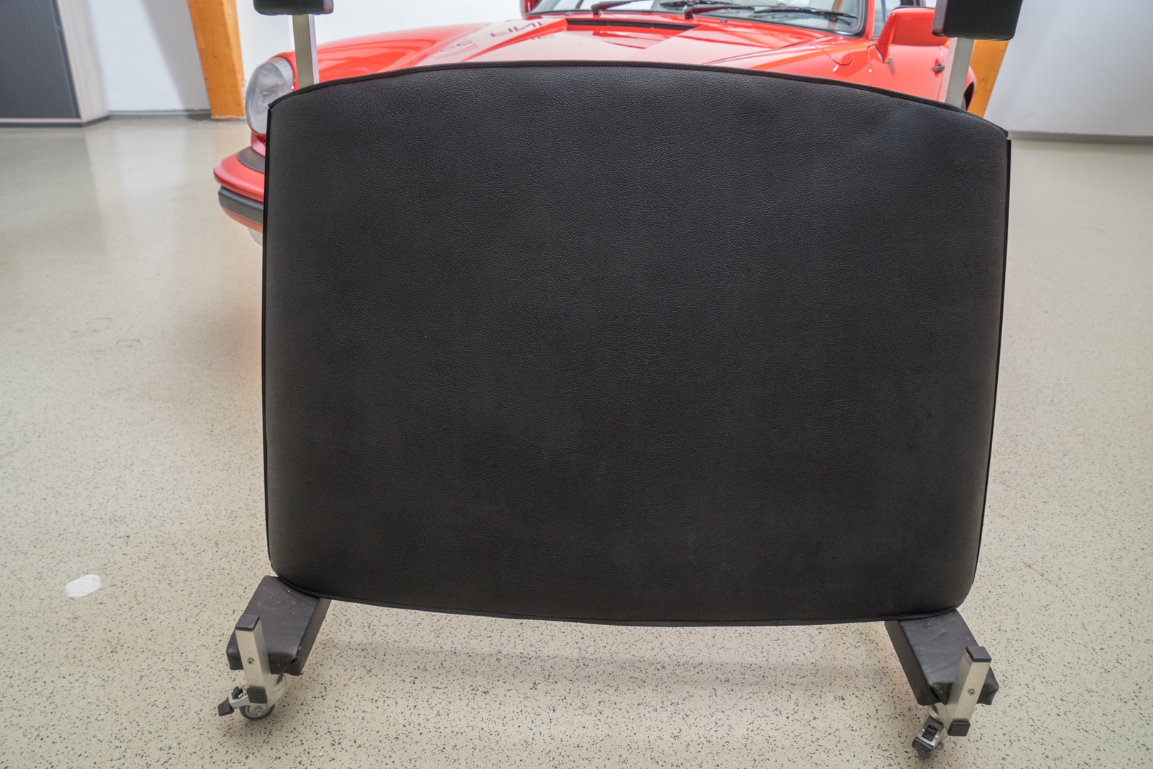 Wir haben den Porsche Targa in der beinahe perfekt erhaltenen Erstlackierung erworben. Das kräftige Indischrot wurde nicht durch übermäßige Sonneneinstrahlung ausgeblichen, ein bekanntes Problem bei dieser Farbe. Nur minimale Kratzer und Steinschläge sind nach 35 Jahren, insbesondere im vorderen Bereich, natürlich vorhanden. Der Targa wurde mit dem Sportpaket geordert. Den Heckflügel haben wir entfernen lasssen. Der Motordeckel wurde dabei neu lackiert.